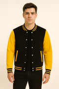 This men's varsity jacket combines classic style with modern layering, featuring a half-sleeve basic T-shirt underneath for added comfort and versatility. Crafted for a tailored fit, the jacket provides warmth and a sharp look, while the V-neck T-shirt layer enhances breathability and ease of movement. Perfect for casual or semi-formal occasions, this combination offers both style and functionality in one cohesive outfit.